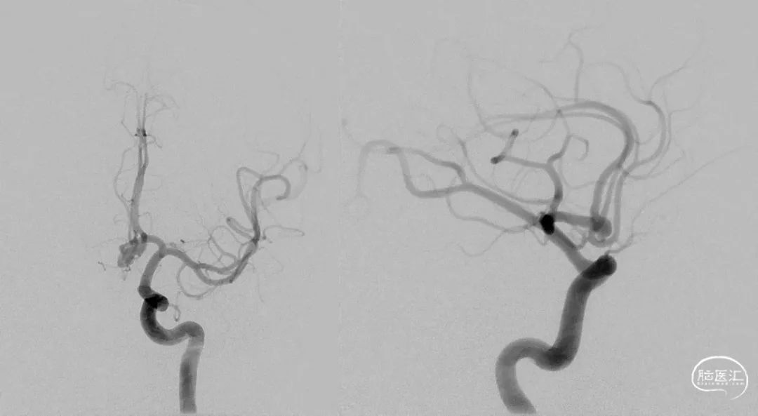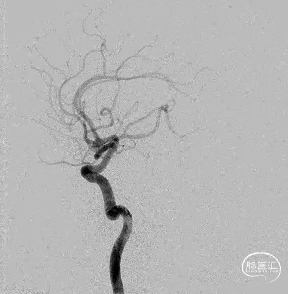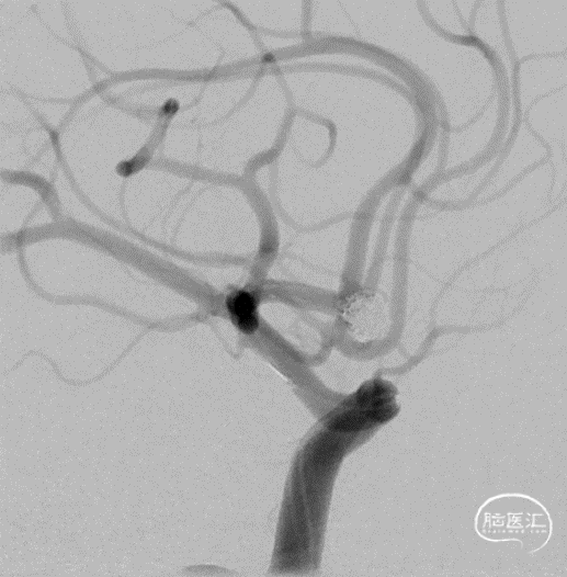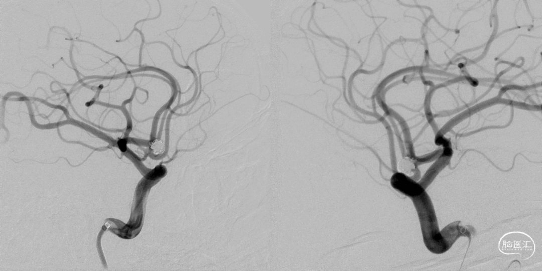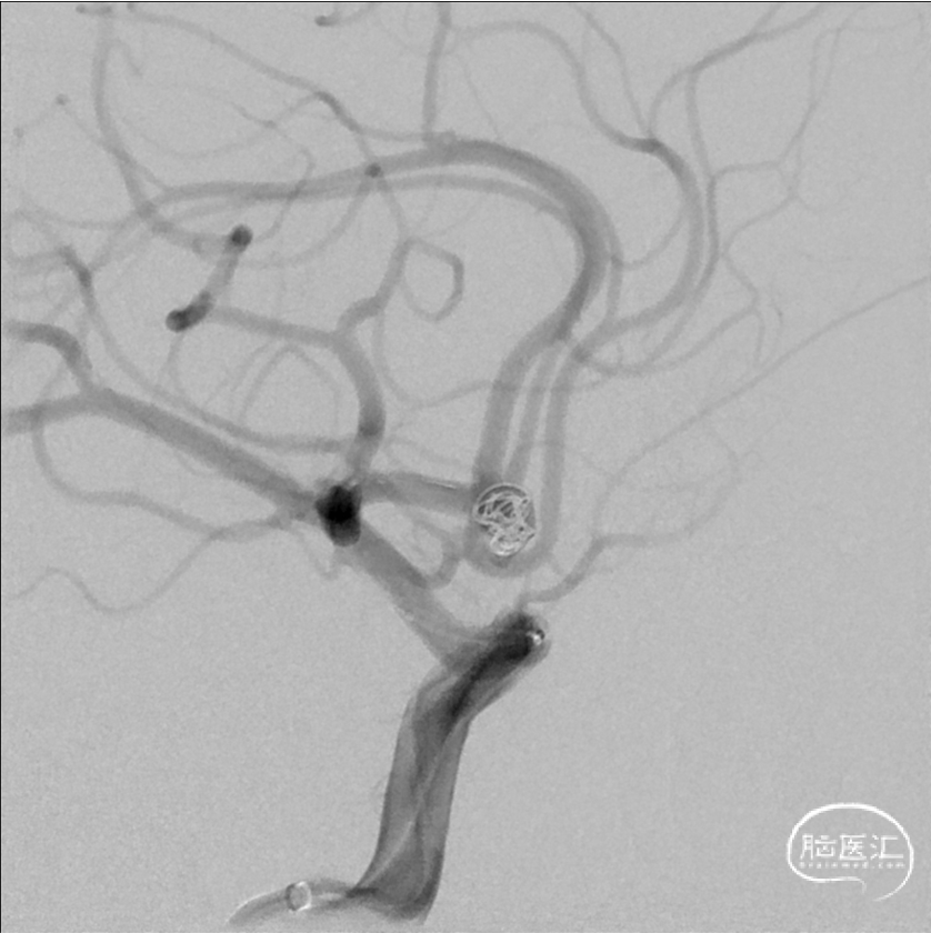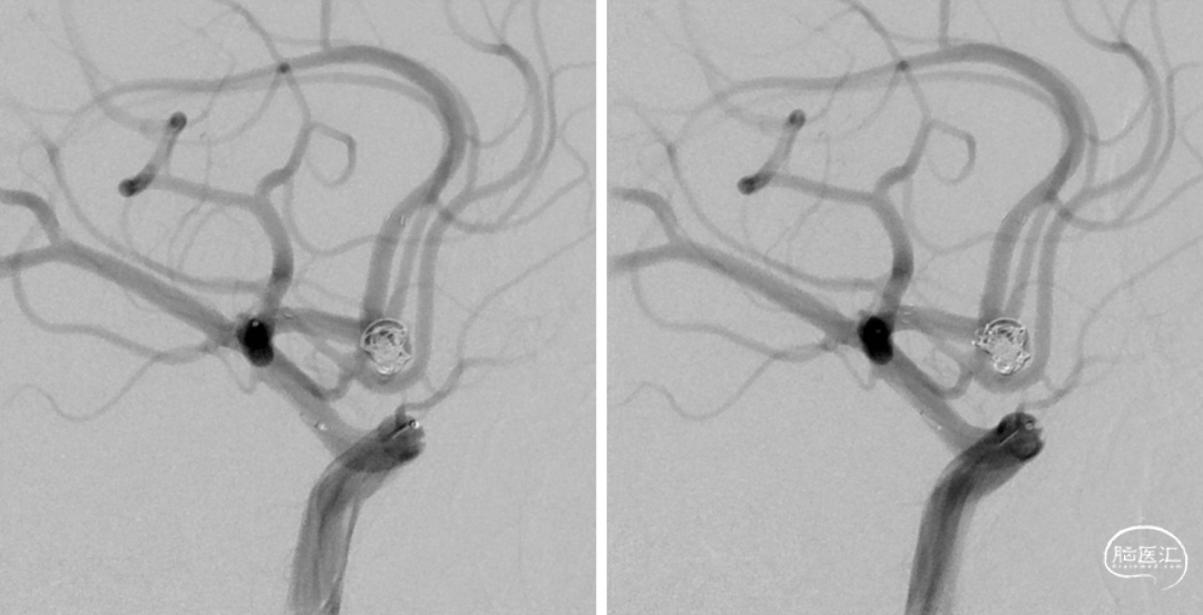 术后正侧位片 动脉瘤完全不显影,双侧A2显影均良好;术后下撤Heralder®DA远端通路导引导管再行颈内动脉造影显示颈内动脉全程无痉挛,提示Heralder®DA远端通路导引导管对颈内动脉的刺激小,无损伤。