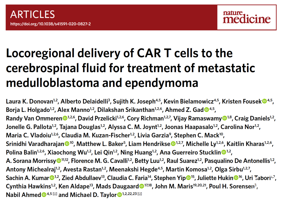 2020年5月,来自加拿大和美国的研究团队在 Nature medicine 期刊上发表了题为Locoregional delivery of CAR T cells to the cerebrospinal fluid for treatment of metastatic medulloblastoma and ependymoma 的文章,报道了在III型髓母细胞瘤和A型后颅窝室管膜肿瘤的CAR-T靶向性免疫治疗研究方面取得的研究进展。该研究一方面发现了相关特异性肿瘤抗原,另一方面采用局部给药联合化疗药的策略在临床前研究中观察到了显著的治疗效果,为上述两种肿瘤患者的临床疗效的提高带来了希望。