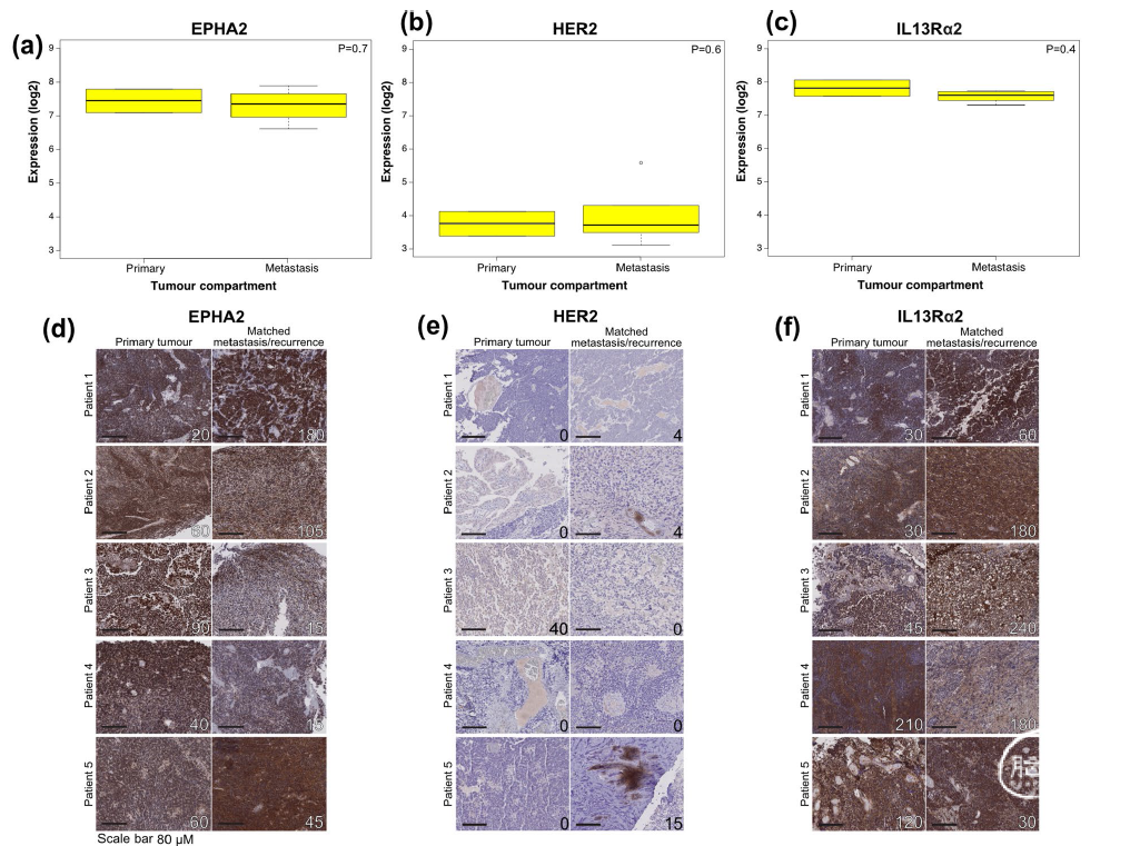 首先,研究团队以正常脑组织为对照,通过微芯片列阵和RNA表达谱数据分析,筛选到在III型髓母细胞瘤和PFA室管膜肿瘤原位癌、转移癌和复发病灶组织中均特异性表达的3个肿瘤特异性表面分子标志物:EPHA2、HER2以及IL-13Rα2。