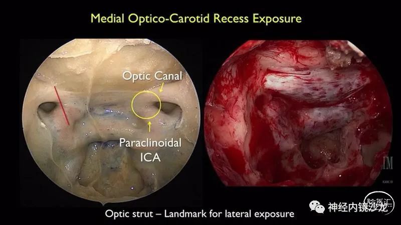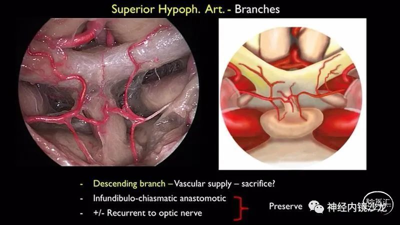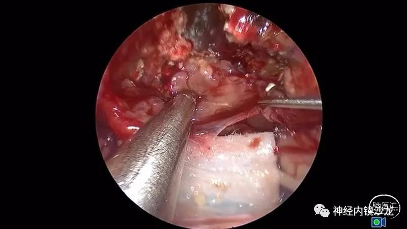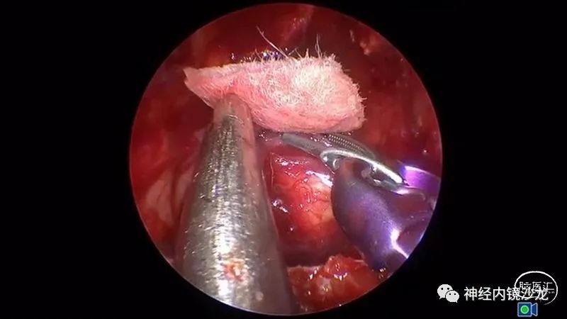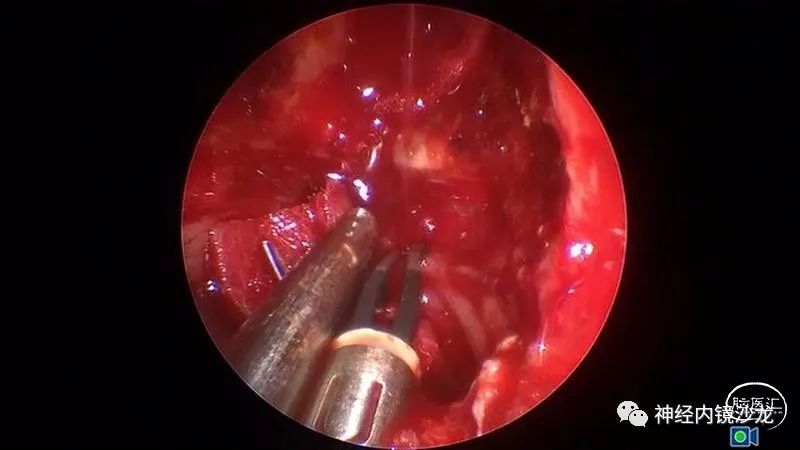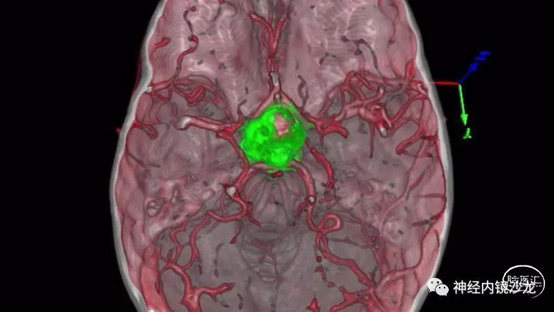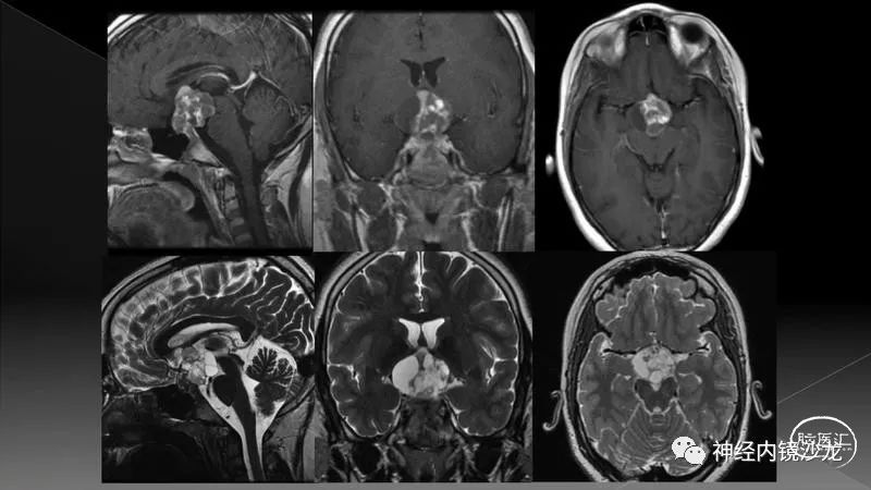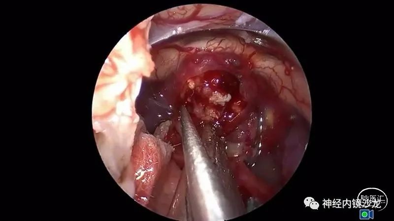 手术暴露充分术野,从蝶骨平台到斜坡,从眼眶到眼眶。切除大块钙化部分肿瘤后,我们找到肿瘤包膜和下丘脑、视觉通路之间的清晰的分离平面。切除结束时,发生了后交通动脉从大脑后动脉撕脱导致的动脉出血。采用单轴持夹器放置一个成角的动脉瘤夹,以夹闭损伤部位并保证供血动脉不狭窄。术后即刻和晚期磁共振成像和CTA检查显示肿瘤全切、无卒中、无假性动脉瘤形成。