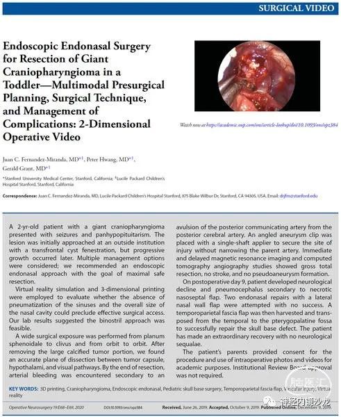 一例2岁的巨大颅咽管瘤患儿,表现为癫痫发作和全垂体功能减退。病变最初在其他机构行经额囊肿开窗术,但后来逐渐增大。我们考虑了多种治疗方案;推荐了内镜经鼻入路,以期最大程度地安全切除肿瘤。