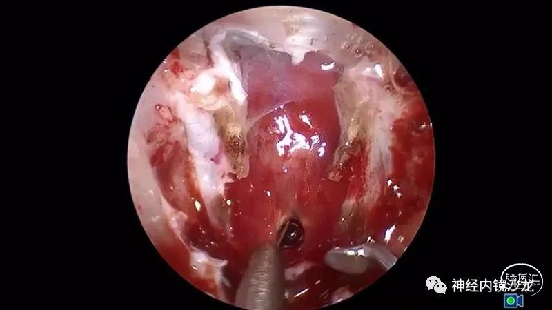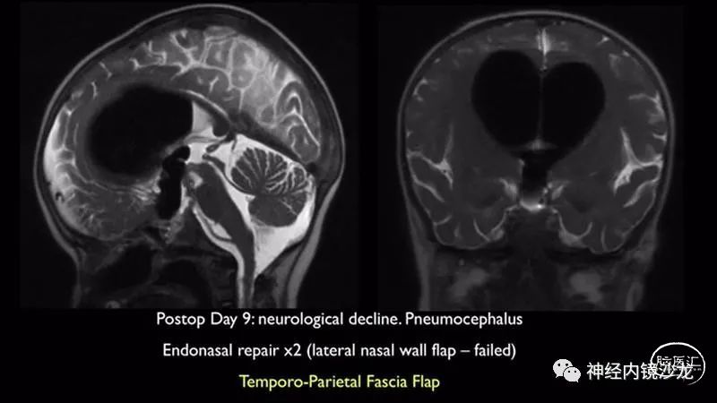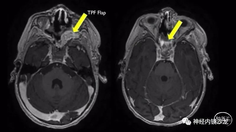 术后第9天,患者出现因为鼻中隔皮瓣坏死导致的神经功能减退和脑内积气。尝试了两次用鼻腔侧壁粘膜瓣进行鼻内修复均未成功。然后采用颞顶筋膜瓣并将其从颞部转移至翼颚窝,并成功修复颅底缺损。患而恢复良好,无神经功能异常。