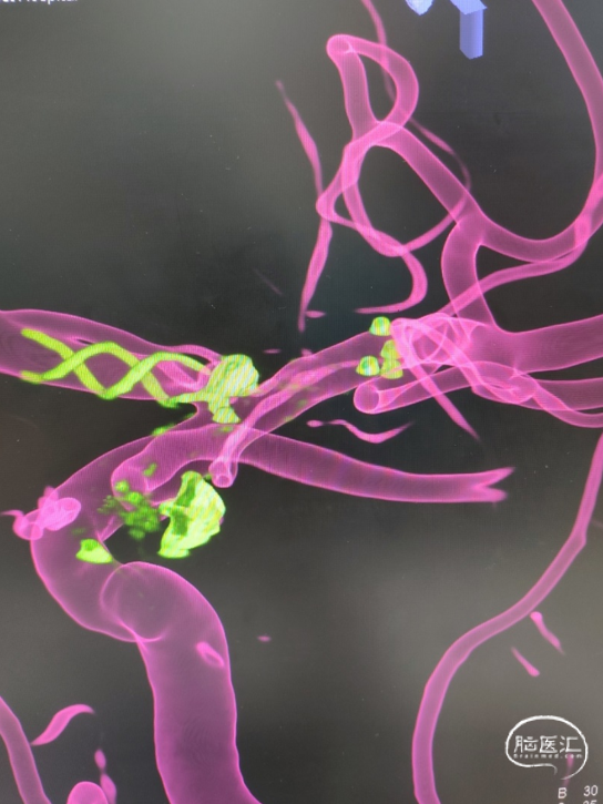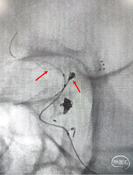 现病史:8月前,患者因头痛1年,发现颅内动脉瘤半月入院,DSA造影显示左侧颈内后交通动脉瘤及左侧颈内动脉分叉部动脉瘤,考虑到患者经济状况,决定先行Solitaire支架下弹簧圈栓塞治疗位于左侧颈内动脉后交通段动脉瘤,支架自大脑中动脉M1放至颈内动脉近端。手术顺利,患者病情平稳后出院。术后8月余,行二期治疗,支架下弹簧圈栓塞左侧颈内动脉分叉部动脉瘤。