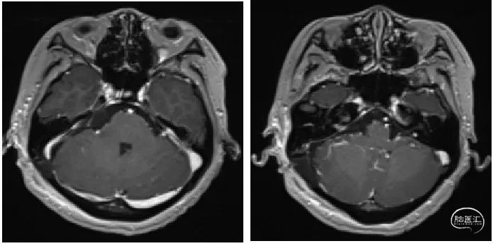 术前T1增强序列示:肿瘤位于桥小脑角处,不均匀强化伴囊性变。