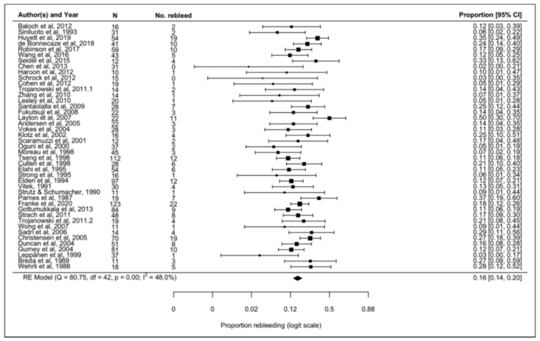 图3. 再出血的森林图显示个体研究结果和随机效应模型计算的比率