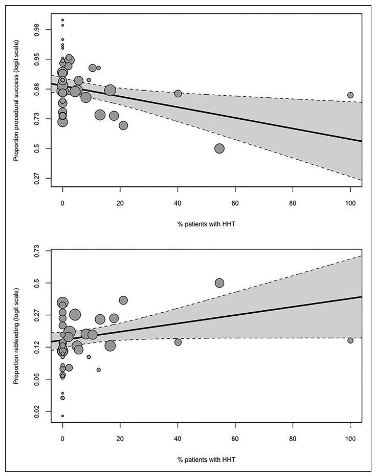 图4. 荟萃回归分析结果显示HHT对手术成功和再出血的影响