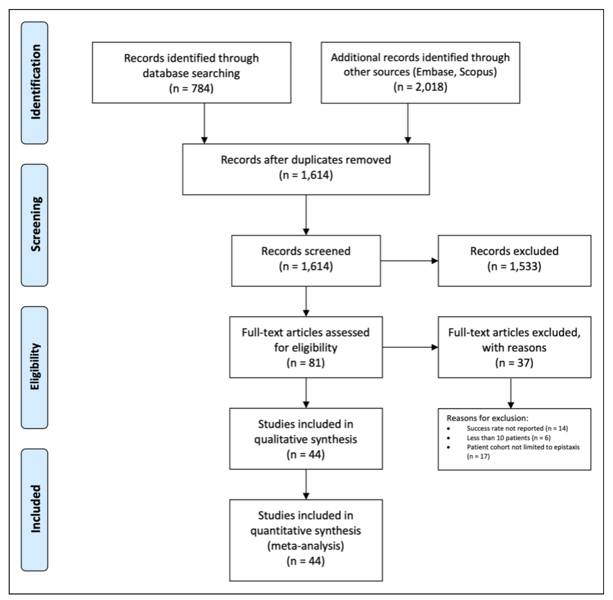 通过检索PubMed、Scopus和EMBASE纳入从1980年起至今的EE治疗鼻出血的研究报告,病例数至少包含10例,并采用随机效应模型获取每项结果(包括手术成功、再出血和并发症)的比率。