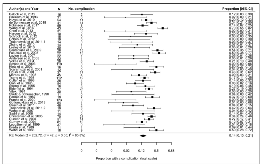 图5. 总体并发症的森林图显示个体研究结果和随机效应模型计算的比率