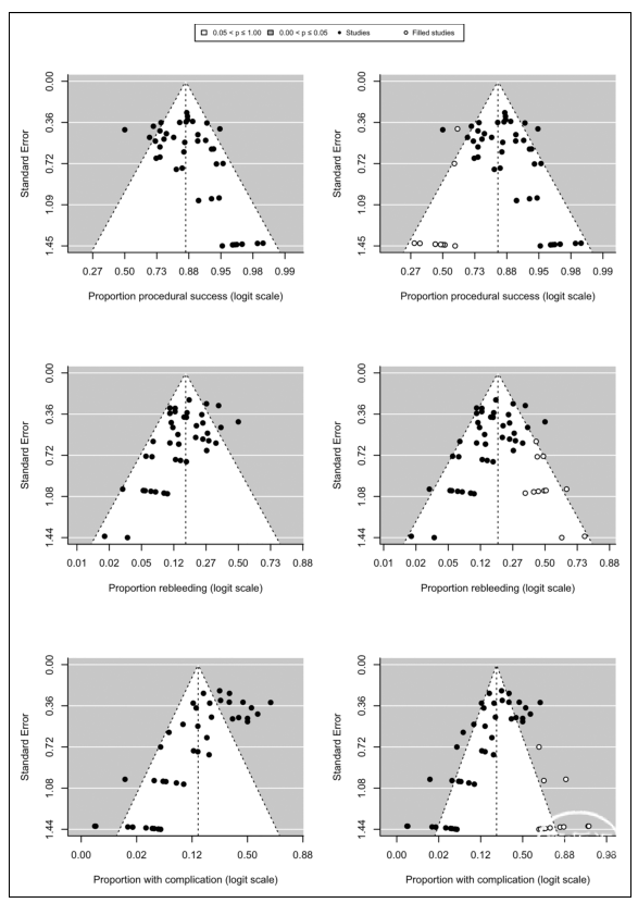 发表偏倚的漏斗图如图6所示,表明发表偏倚与手术成功、再出血和并发症有关。Egger试验证实漏斗图不对称影响手术成功(p < 0.001)、再出血(p < 0.001)和并发症(p < 0.001)的比率。调整后的手术成功率为84.8 (95% CI 81.4-87.8)、再出血率为18.9 (95% CI 15.8-22.4)、并发症发生率22.4 (95% CI 15.2-31.6)。