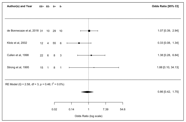 在四项比较EE和手术结扎的研究中,每组手术成功率分别为79.2%和83.3%。手术组包括经鼻内镜蝶腭动脉(SPA)结扎术、包括或不包括筛窦结扎的颌内动脉结扎术、经窦颌内动脉结扎术。如图7所示,与手术结扎相比,EE的成功率无明显差异(OR 0.86, 95% CI 0.42-1.75, I2=0%)。
