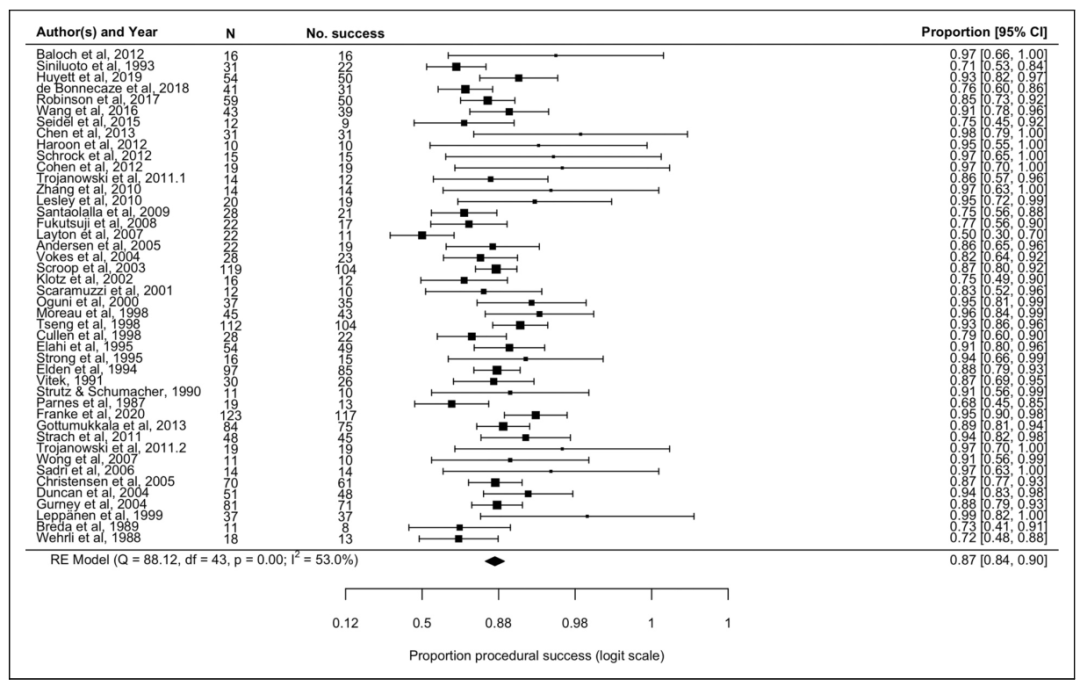 图2. 手术成功的森林图显示个体研究结果和随机效应模型计算的比率