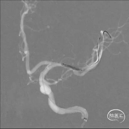 术中将Navien导管送至颈内动脉岩骨段,增加支撑力,将两条微导丝分别送入左大脑中动脉上下干,先沿上干微导丝送入球囊扩张,效果差, 再沿下干微导丝送入球囊扩张,效果仍差,大脑中动脉M1末端狭窄有改善,但狭窄仍较重,遂用赛诺神畅 颅内药物支架NOVA DES®2.25*10mm置入左大脑中动脉M1末端及上干内,球囊扩张成形,支架成形好,血管成形满意,确定下干无闭塞后,撤出下干微导丝。