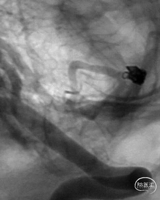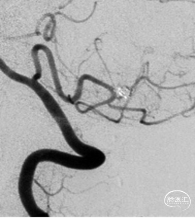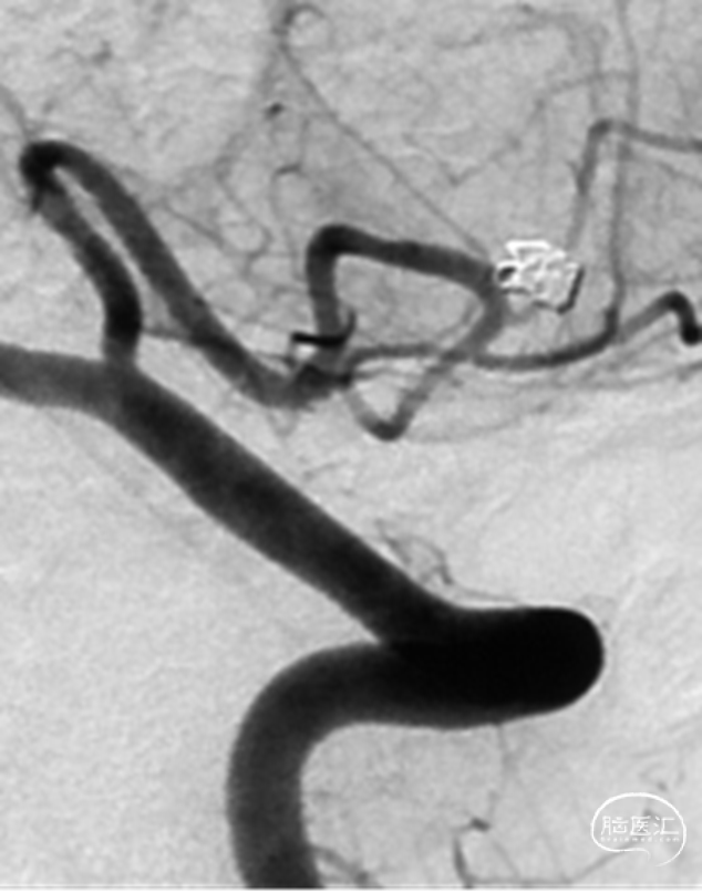 45岁女性患者,突发后枕部疼痛伴有恶心呕吐3小时。造影显示小脑后下动脉动脉瘤,术中给予单纯弹簧圈栓塞及载瘤动脉闭塞术。