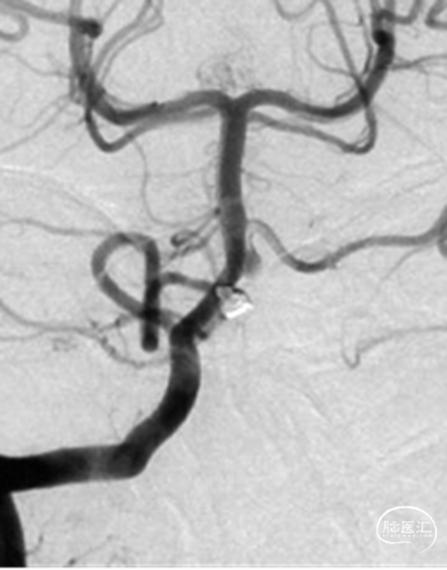 行单纯弹簧圈栓塞及载瘤动脉闭塞术。术后即刻造影提示动脉瘤不显影,载瘤动脉闭塞,侧枝代偿良好