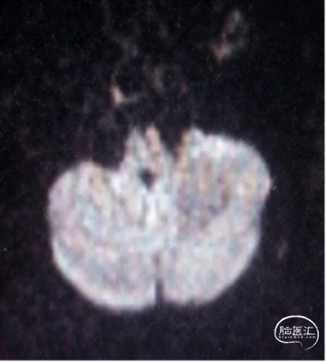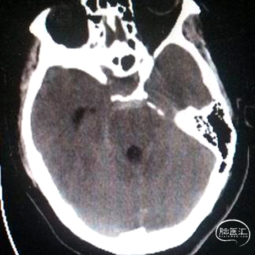 发病当天头颅CT提示蛛网膜下腔出血,出血以环池周边为主,右侧侧脑室后角少量积血