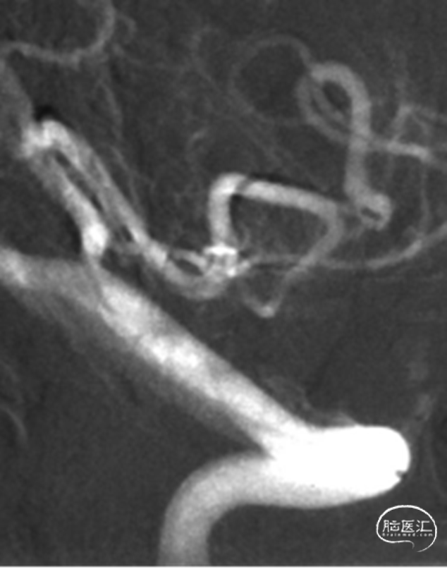 虽然说PICA常与对侧或小脑表面其他血管吻合丰富,一侧PICA远端闭塞,不会导致明显神经功能障碍,但还是需要在术前对患者侧枝代偿情况进行评估。PICA近端动脉瘤(前延髓段、外侧延髓段及扁桃体延髓段),因载瘤动脉可能存在脑干供血分支,故治疗上应尽量采取瘤内栓塞为主,可采用支架辅助栓塞技术。远端可使用弹簧圈或胶栓塞,但要注意胶弥散范围,尽量减少对分支的影响以及避免返流到近端主干或基底动脉。