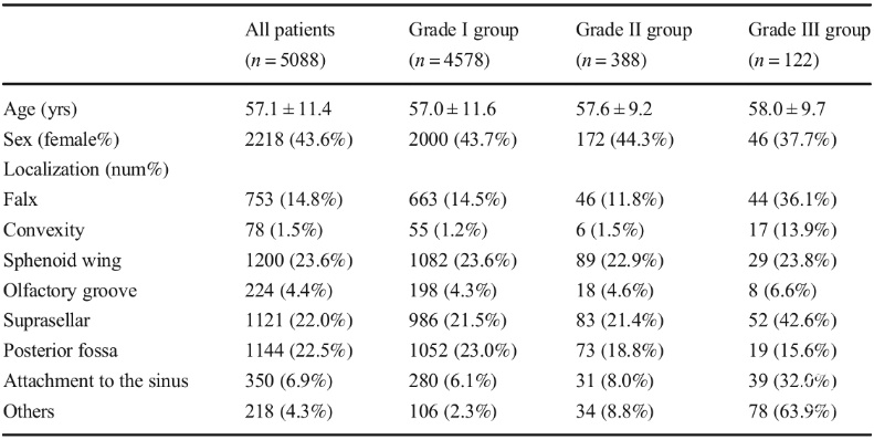 脑膜瘤起源于中胚层的蛛网膜,是常见的原发性颅内肿瘤,占颅内肿瘤的20%。大多数脑膜瘤是良性肿瘤(WHO I级);高级别脑膜瘤(WHO II/III级)占6%-18%,具有侵袭性,术后易复发。WHO II和III级脑膜瘤的复发率分别为30%-40%和50%-80%,级别越高,复发率越高,五年生存率分别为78.4%和44.0%。组织病理学分级可以预测脑膜瘤的生物学行为和预后;MRI成像显示脑膜瘤结构和血供等详细信息,是脑膜瘤诊疗和监测的重要手段。脑膜瘤术前体积评估和分级对治疗计划和预后判断具有重要意义。为确定深度学习在脑膜瘤检测与分级上的作用,北京天坛医院神经外科的张凯等设计用于脑膜瘤自动检测和组织病理学预测的深度学习模型。结果发表于2021年7月的《Neuroinformatics》杂志。研究回顾性分析2009年至2019年在北京天坛医院神经外科就诊的脑膜瘤患者数据。资料纳入研究的标准:1、行切除手术;2、切除的肿瘤标本依据WHO分级作组织病理学诊断;3、高质量影像学数据;4、无严重创伤性脑损伤史;5、无严重外伤史所致脑软化和严重的或弥漫性脑萎缩;6、未再次手术史。采集患者颅脑MRI数据、影像学预处理的肿瘤分割、设计自动深度学习的脑膜瘤分割模型和肿瘤分级网络结构,采用PSPNet场景网络解析深度学习建模。结果显示,该研究共纳入病理学诊断脑膜瘤的5088例患者,其中2218例女性,平均年龄57.1±11.4岁。WHO I级4578例,II级388例,III级122例;肿瘤部位,镰旁脑膜瘤753例、凸面脑膜瘤78例、蝶骨嵴脑膜瘤1200例、嗅沟脑膜瘤224例、鞍上脑膜瘤1121例、后颅窝脑膜瘤1144例以及窦旁脑膜瘤350例(表1)。
