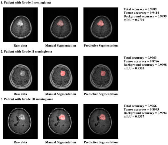 图1. 不同级别脑膜瘤的分割示例。左列:颅脑MRI-T1序列轴位增强像;中列:肿瘤手动分割;右列:深度学习模型的预测性分割。研究者基于上述精准的脑膜瘤分割模型对肿瘤分级性能进行检测,对其余3212例患者进行自动分割。再将5088例MRI有病变患者的80%资料用于训练ResNet模型,其余用于测试数据集。结果显示,对于肿瘤分级,深度学习模型对所有患者的训练和测试数据的准确率分别为99.93%和81.52%;WHO I级脑膜瘤分别为99.98%和98.51%;II级脑膜瘤为99.91%和66.67%;III级脑膜瘤的为99.88%和73.91%(图2)。