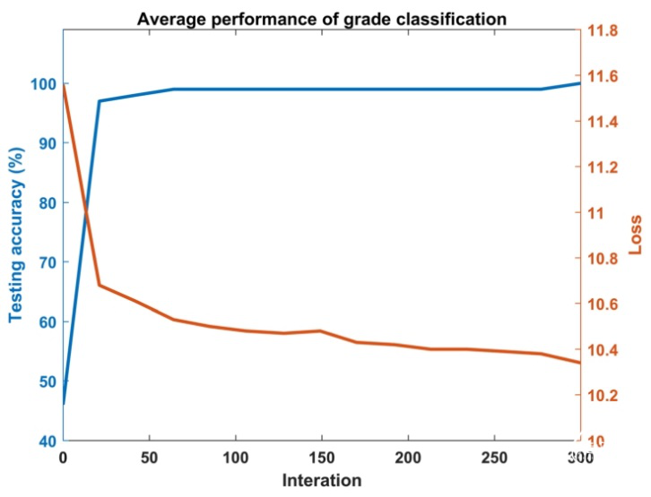 图2. 深度学习对肿瘤分级的表现。蓝线:表示随着迭代次数增加,精度逐渐提高。橙线:表示随着迭代次数增加,损失逐渐减少。