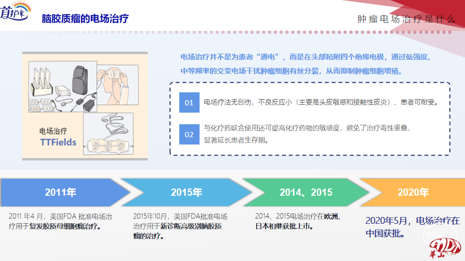 然后,吴教授介绍了胶质瘤的治疗手段,包括手术、放疗、化疗以及新型物理治疗手段(肿瘤电场治疗)等。