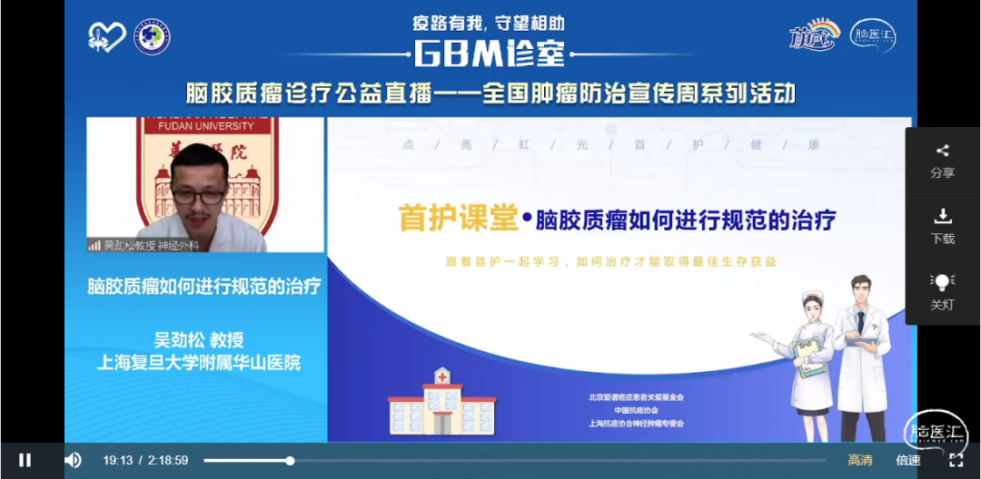 复旦大学附属华山医院神经外科吴劲松教授首先带来主题为“脑胶质瘤如何进行规范化诊疗”的精彩科普内容。