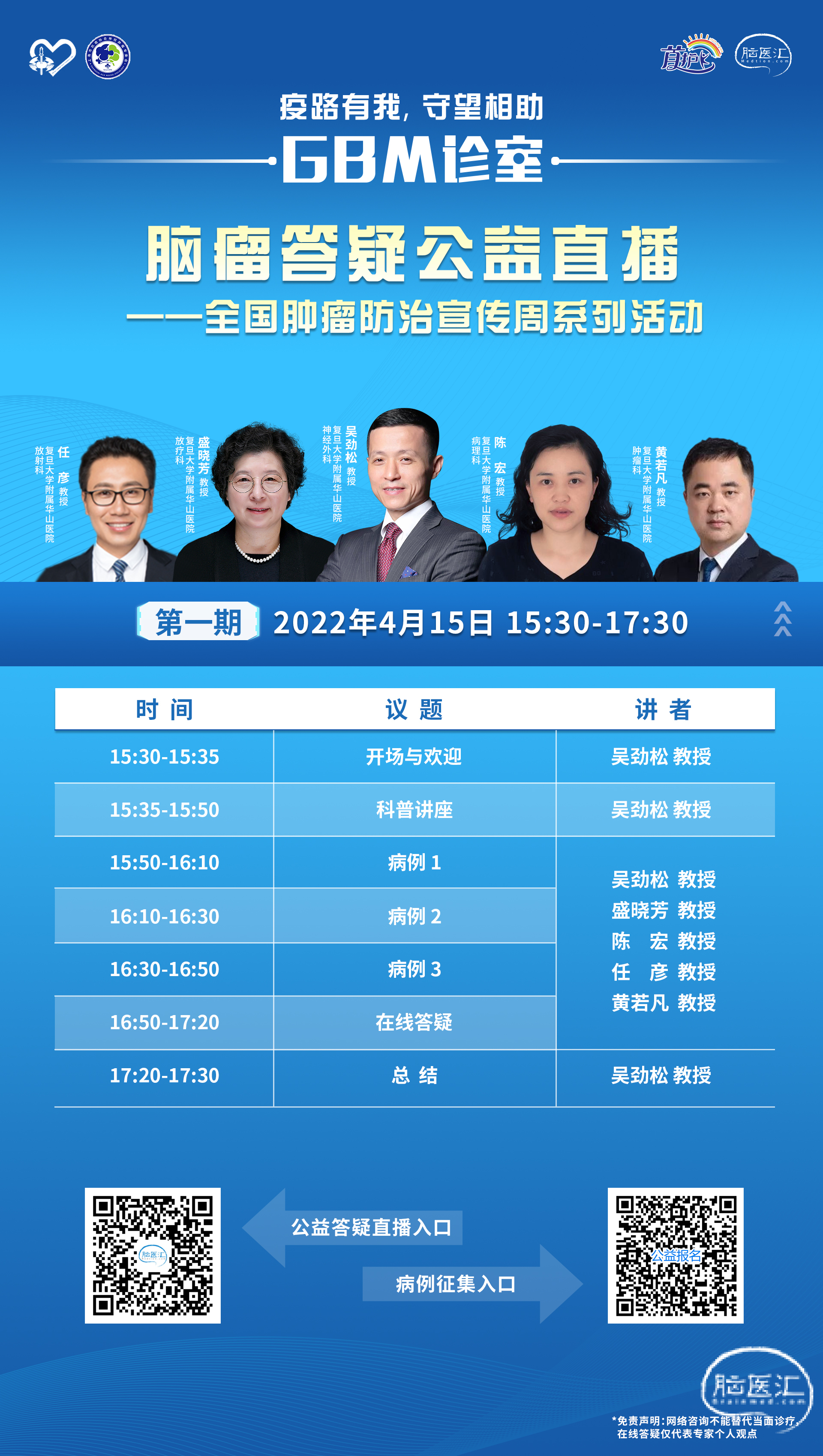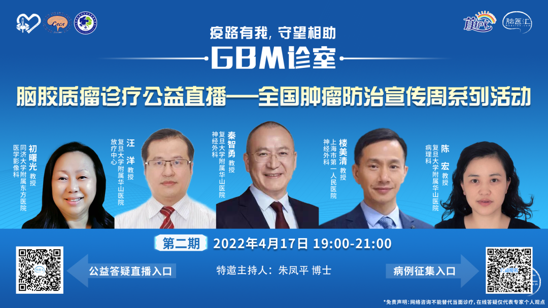 下期预告:4月17日19:00-21:00,我们将邀请到复旦大学附属华山医院神经外科秦智勇教授、上海市第一人民医院神经外科楼美清教授、复旦大学附属华山医院肿瘤放疗中心汪洋教授、同济大学附属东方医院医学影像科初曙光教授、复旦大学附属华山医院病理科陈宏教授为患者及其家属提供答疑咨询,敬请期待!