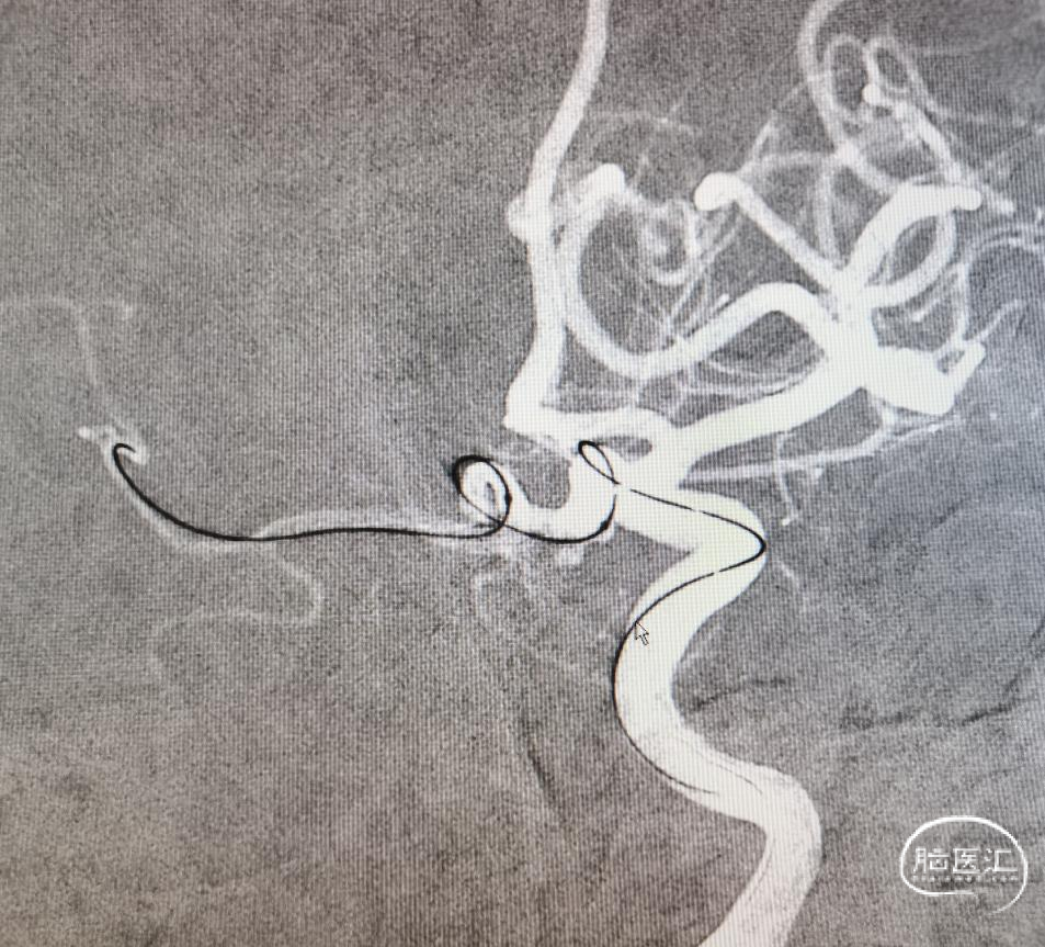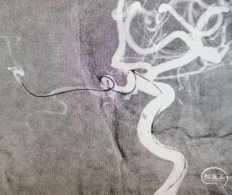 三米交换导丝,顺利到位。就看支架导管得了。既往有过顶破的经历,因此特别小心。好在三米支撑导丝的支撑能力比较好。但是也是一点一点的调整支架导管的位置,好在一切努力没有白费,支架导管一点一点越过后交通动脉起始,慢慢爬过过度弯曲之处。好在导管还能前行一些,紧绷的心终于放下了。起码离成功还有一半。于是就是弹簧圈微导管的到位,塑了个“猪尾”,第一次角度稍微大了一点点。如图。到位还算容易。也没有想太多,直接就用最小的圈,先把瘤填上,防止再次出血,可是现实并没有那么容易。