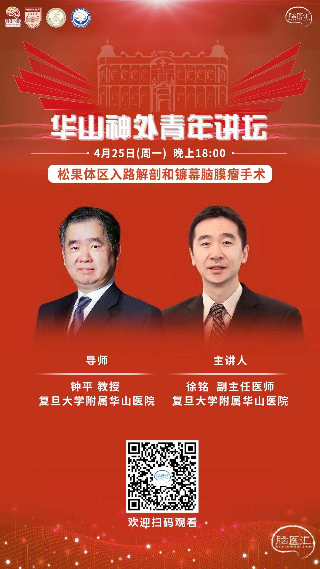华山神外青年讲坛新一季将于2021年11月15日正式开启,每两周一次,周一晚上18:00-19:00双周刊在线课程。由复旦附属华山医院周良辅院士和毛颖院长担任名誉主席,赵曜教授与朱巍教授共同担任执行主席。具体日程安排会定期更新,欢迎广大神经外科同道观看交流。