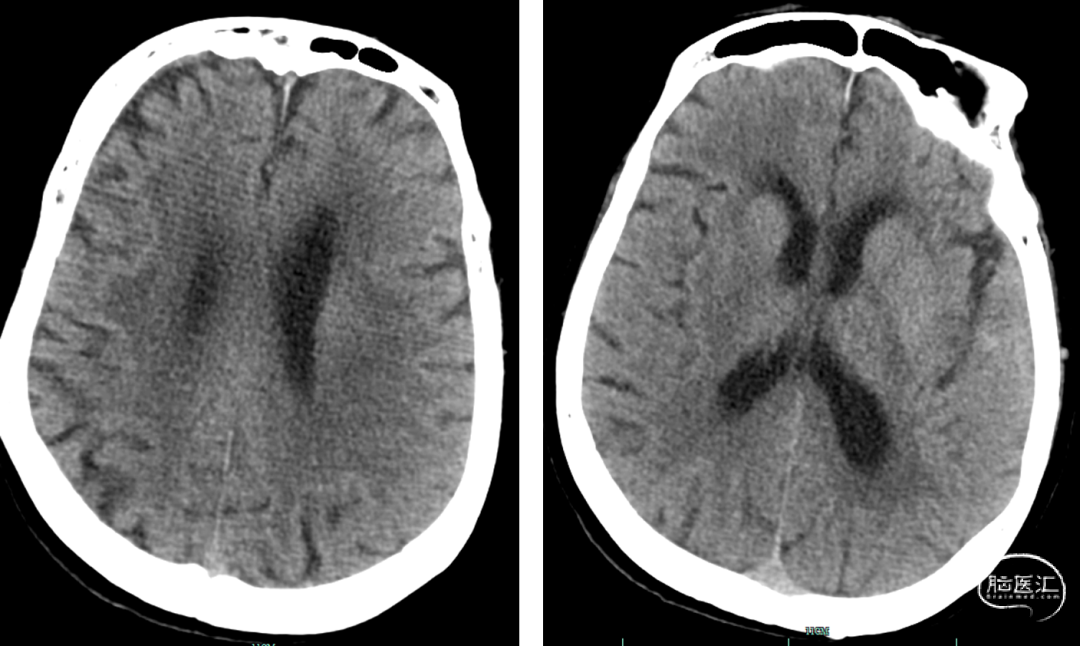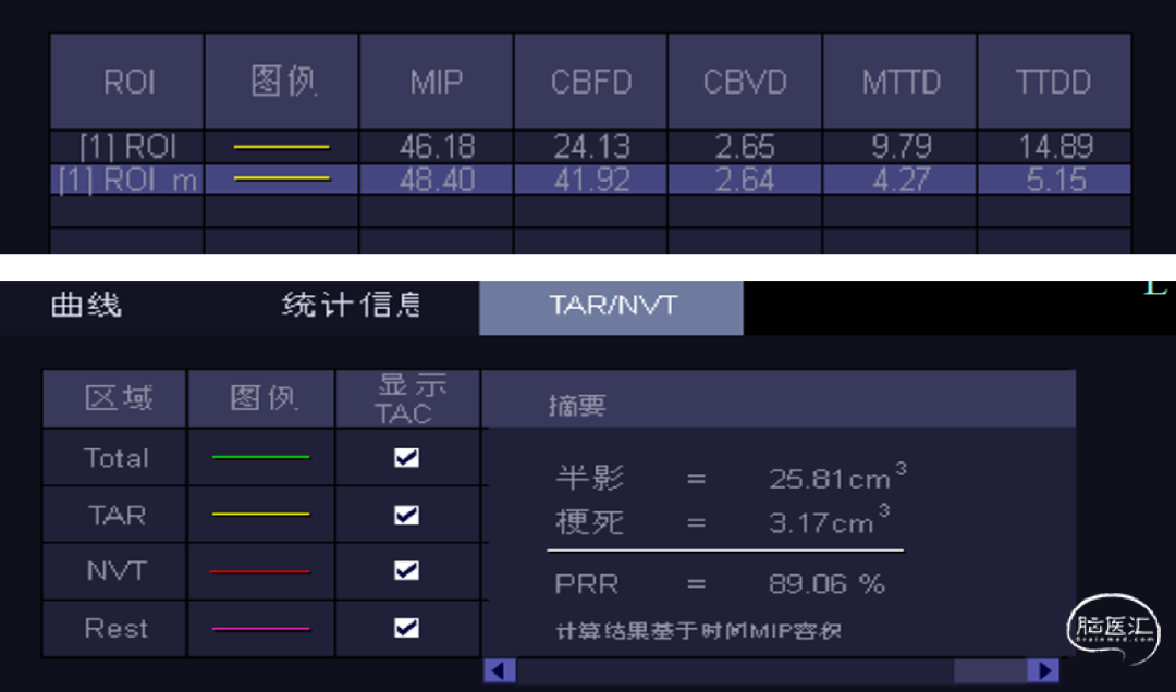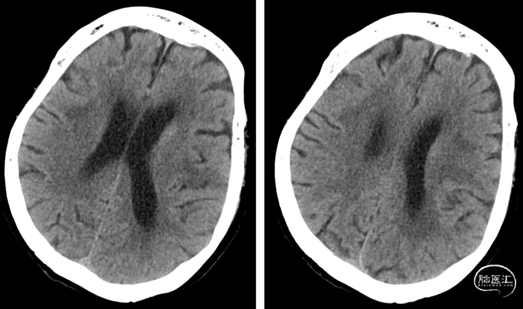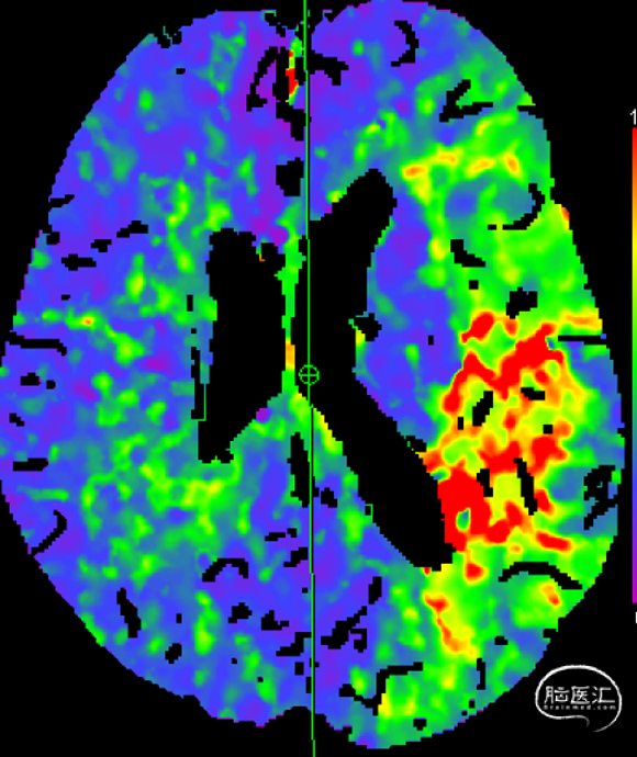 患者入院后(2-22 21:30PM)症状加重,部分混合型失语,右上肢肌力0级,右下肢肌力3级,右侧鼻唇沟变浅,NIHSS评分12分。(急诊CTP)。