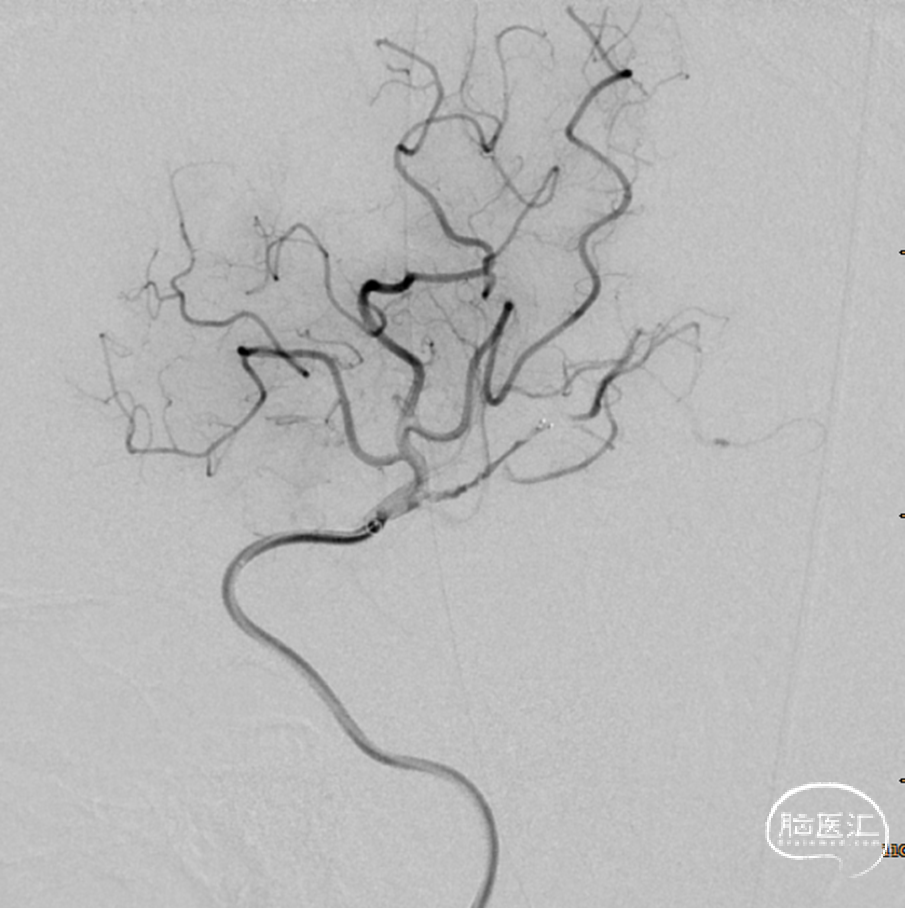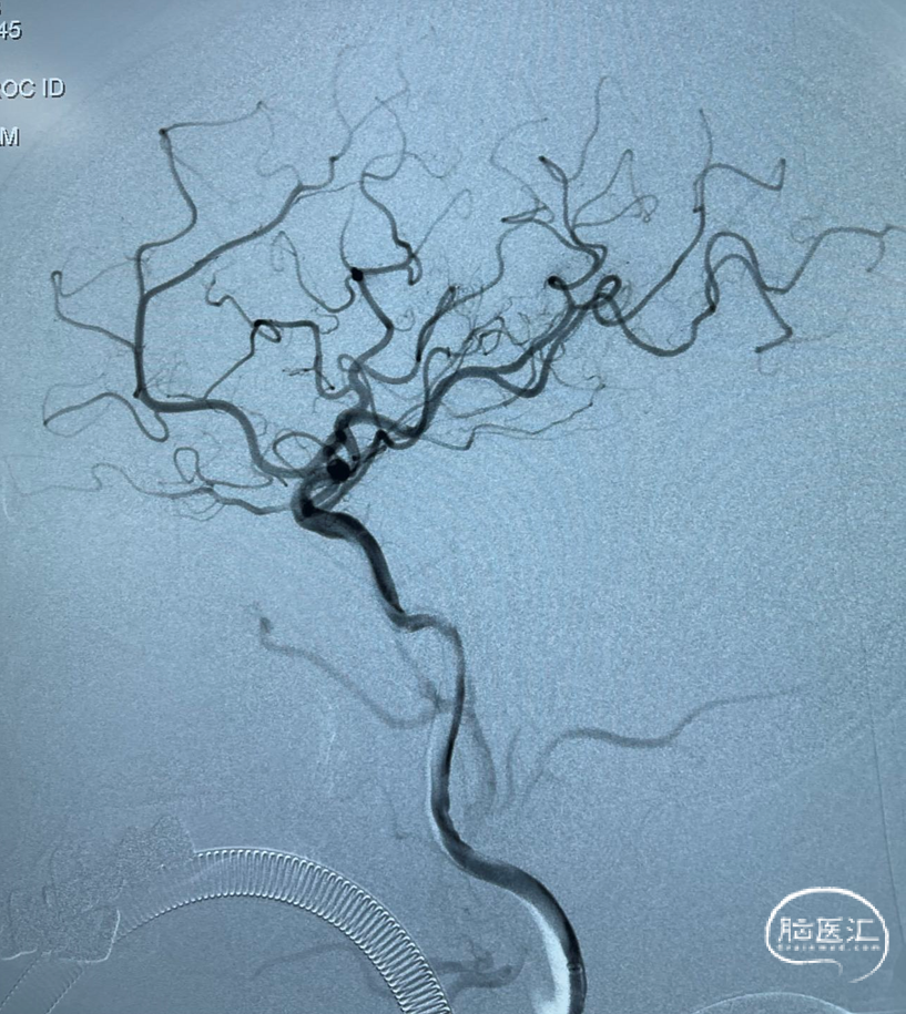 术后DynaCT,有少量造影剂外渗。予速尿针、白蛋白针、甘露醇针脱水预防脑水肿,阿司匹林肠溶片、抗血小板,强化他汀治疗。