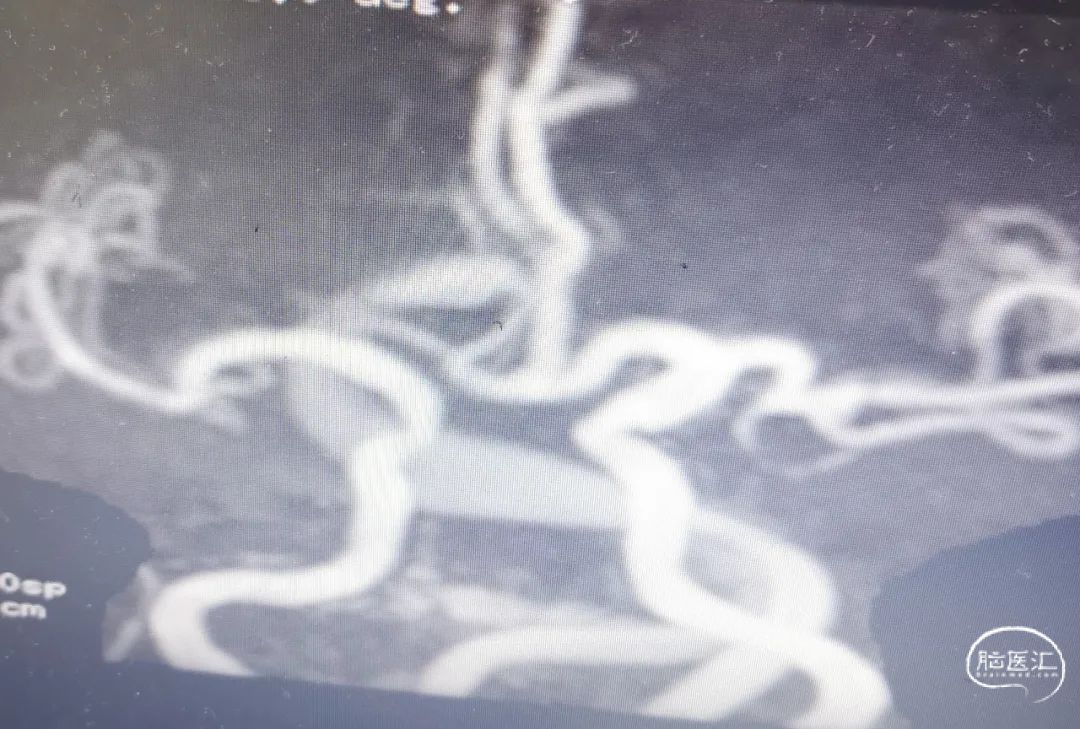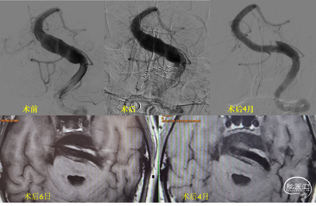 男性,44岁,头晕、复视,构音障碍1月余,mRS:1分,MR提示脑干梗死,基底动脉扩张。(图1)