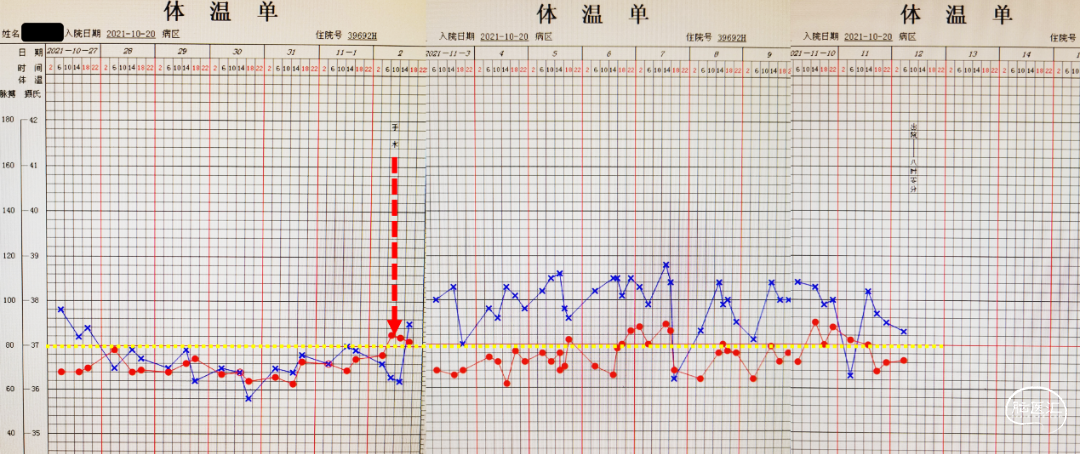患者自术后开始发热,未找到感染证据,发热持续30余日体温回归正常(图4)