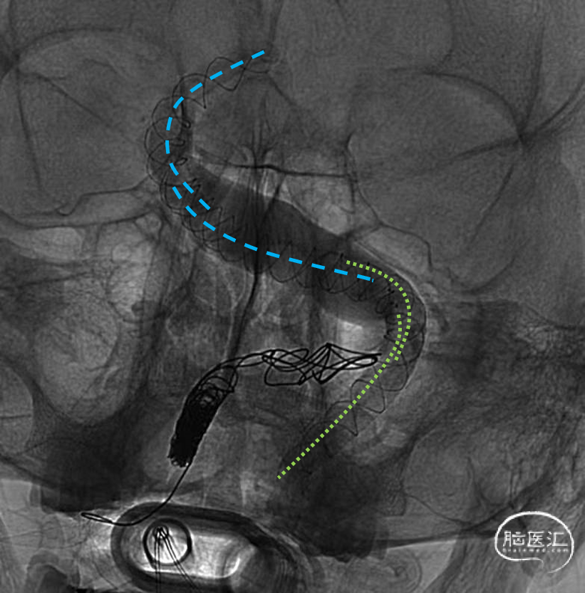 常规全麻后股动脉入路,将Evony 6F(Cerenovus)送至左侧椎动脉V2远端,路径图指引下,将Vasco 28(Balt)导管置于BA顶端,送入LEO+(Balt)5.5-75mm在BA顶端释放,之后沿支架内导丝将Vasco导管送入支架内,送入第二枚LEO+5.5-75mm支架(图2:蓝色虚线),与第一枚支架部分重合后延续释放,以此方式依次再次植入两枚LEO+5.5-50mm支架(图2:绿色虚线),复查造影见支架内血流通常,各分支动脉显影无延迟。再将Evony送至右侧椎动脉V2段,以弹簧圈闭塞右侧椎动脉V3段(图2)。