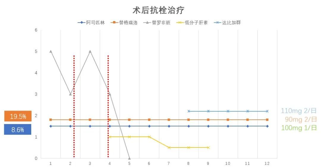 多个LEO支架的植入会导致血栓事件的增加,本例患者应用了三种抗血小板药物仍未能有效控制血栓的发生,除了病变本身的特点以外,可能还与抗栓途径有关;本例手术的方案是将原本的瘤腔进行分隔,使支架外腔血栓化,由于支架外腔的血流较为缓慢,其血栓的成分可能更类似于静脉内的血栓,而非支架内腔中以血小板为主的血栓;因此,单纯的抗血小板治疗可能难以延缓血栓化的速度,这也可能是加用了抗凝治疗后病情得以稳定的原因。4月复查凝血时Dimor升高,提示抗凝药物仍在发生着作用,这也是我只减抗聚,未停抗凝的原因。但多种抗栓药物联用的“鸡尾酒疗法”所伴随的出血风险还是令人担忧的。