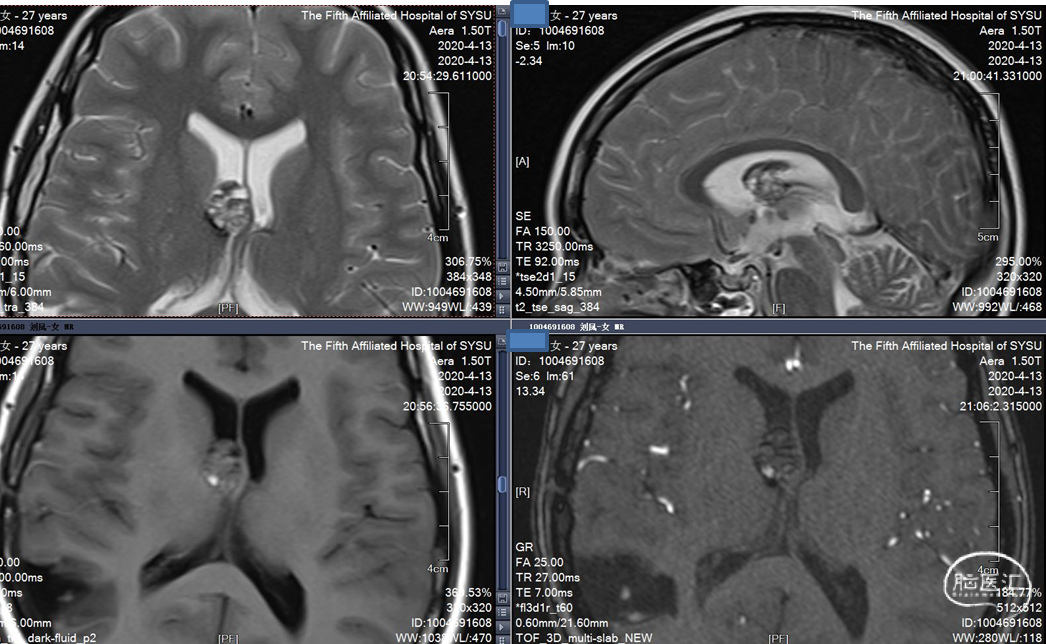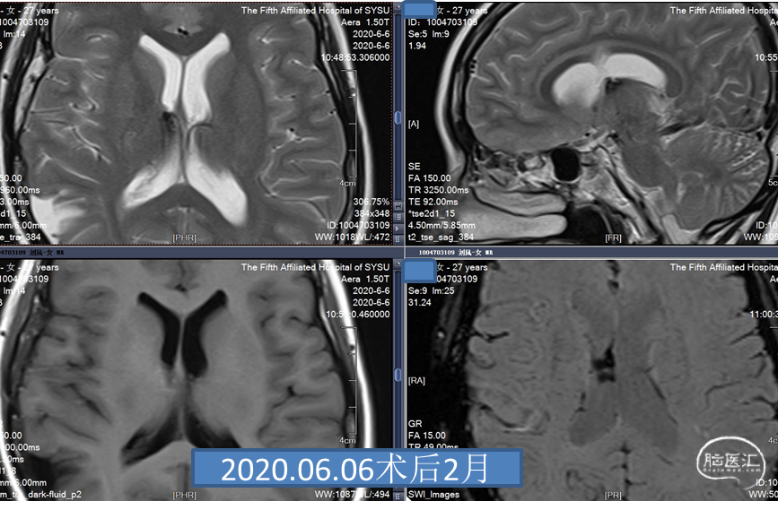 患者,女,27岁,发现脑室旁海绵窦状血管瘤,是一种多发的海绵状血管瘤。反复出血两次,用显微镜手术。9天后复查,可见一定血丝,2个月后复查,很干净,病人无明显病灶。今年复查见对侧丘脑有一血肿,手术难度大。