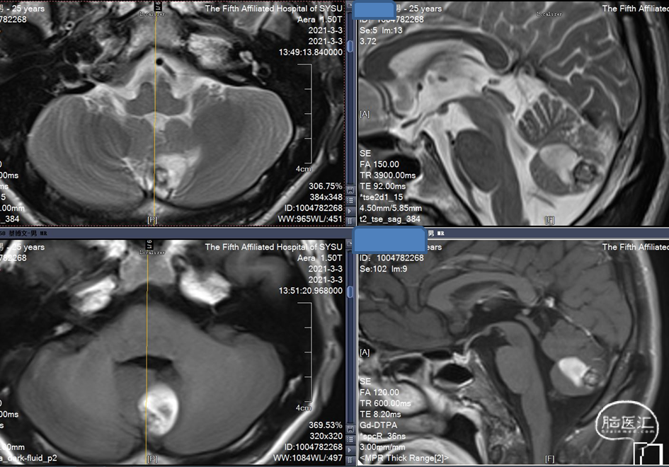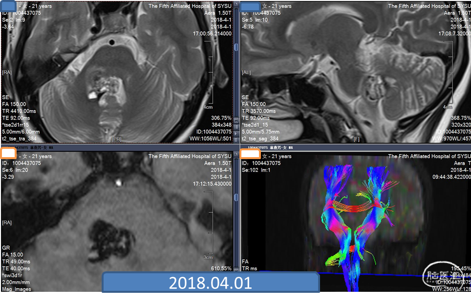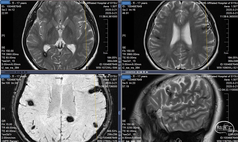 脑干海绵状血管瘤是一种多发的海绵状血管瘤。患者于2017年发现海绵状血管瘤,2018年由于反复出血做手术,手术效果好。2020年11月,患者头痛并有出血症状。2020年12月再次出血,第二次手术。复查CT,情况良好。