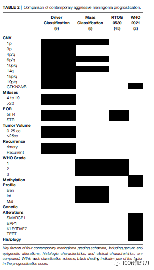比较了四种目前脑膜瘤分级模式的关键因素,包括遗传和表观遗传改变、组织学特征和临床特征。在每个分类方案中,黑色阴影表示在预测评分中使用了该因素。