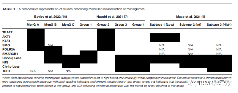 (在每个分类方案中,根据无进展生存期日益恶化从左到右对脑膜瘤亚组排序。对每个亚组的遗传突变和染色体缺失进行比较,黑线表示该亚组中占主导地位的突变/缺失,空细胞表示在该亚组中检测的突变/缺失,不存在或显著劣势,N/A表示该研究未检测或未报告突变/缺失。)