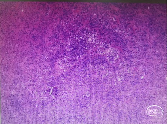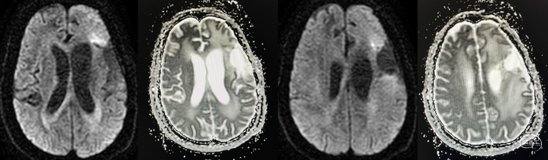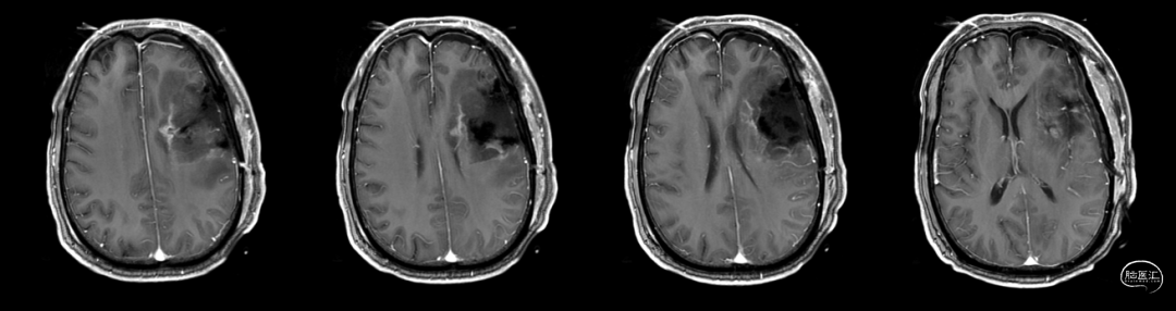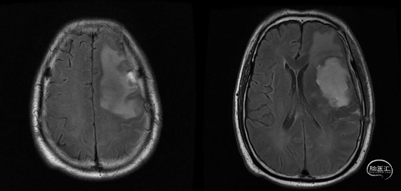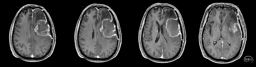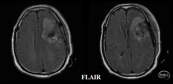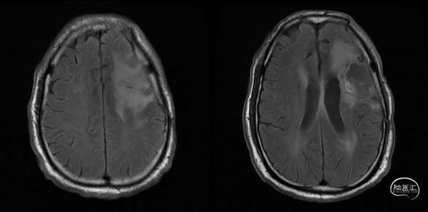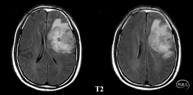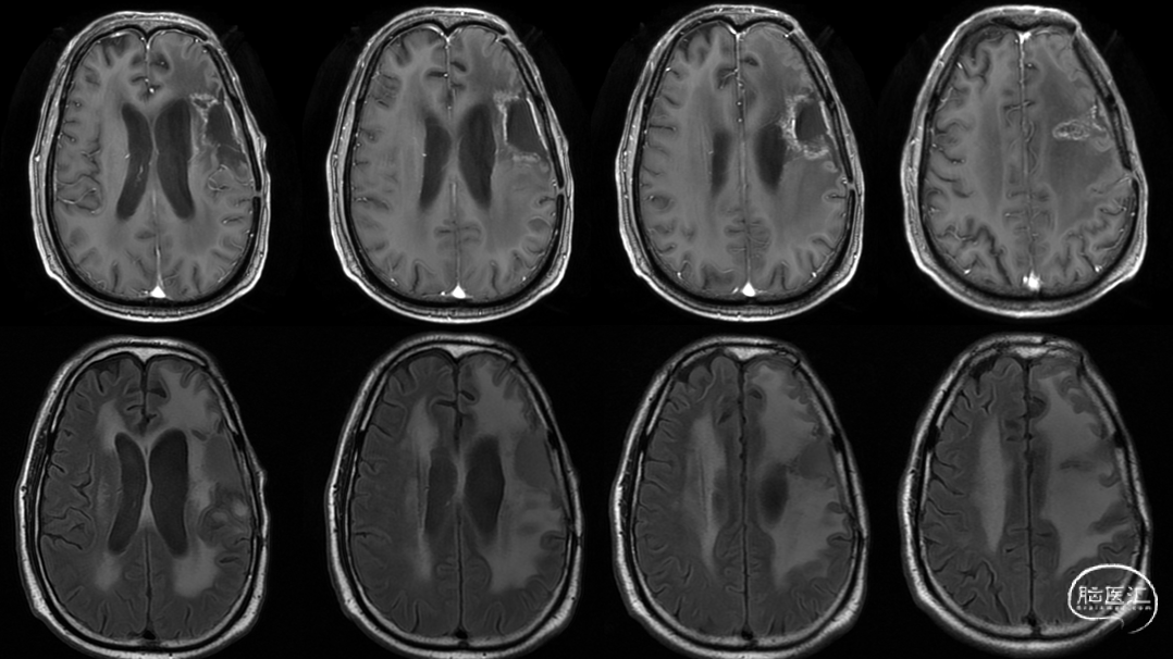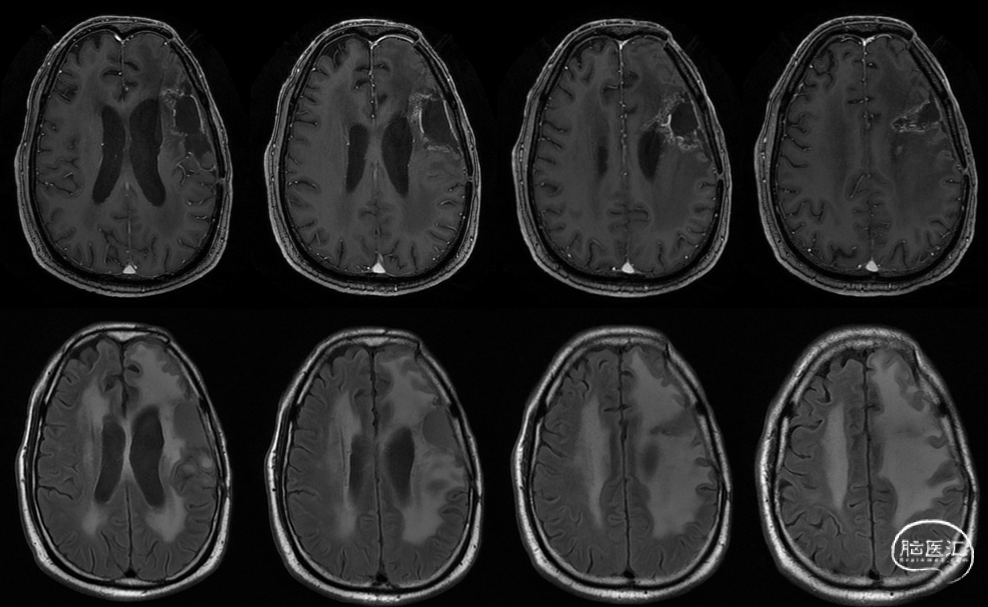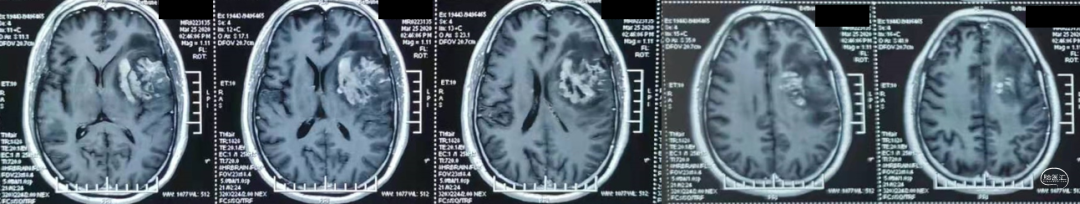 入院前头MRI(2020-3):左侧额岛叶肿块,信号不均匀,其内可见出血和坏死,占位效应明显,周围见水肿。考虑左额岛叶肿瘤(高级别脑胶质瘤可能性大)。于2020年4月行左额岛叶占位性病变切除术。术中见肿瘤组织位于左侧额中回及额下回后部,大小约4m×5cm×5cm,呈烂鱼肉样,色灰红,质软,部分坏死,血运中等,边界不清,侵犯左侧岛叶向下挤压颞叶。显微镜下沿肿瘤周边胶质增生带完整切除肿瘤。术后48小时内复查头MRI平扫、加强,影像显示术腔边缘不规则线样强化,靠近放射冠及侧脑室壁强化明显,可疑少许残存。