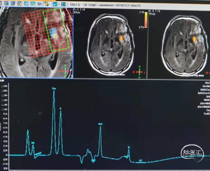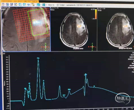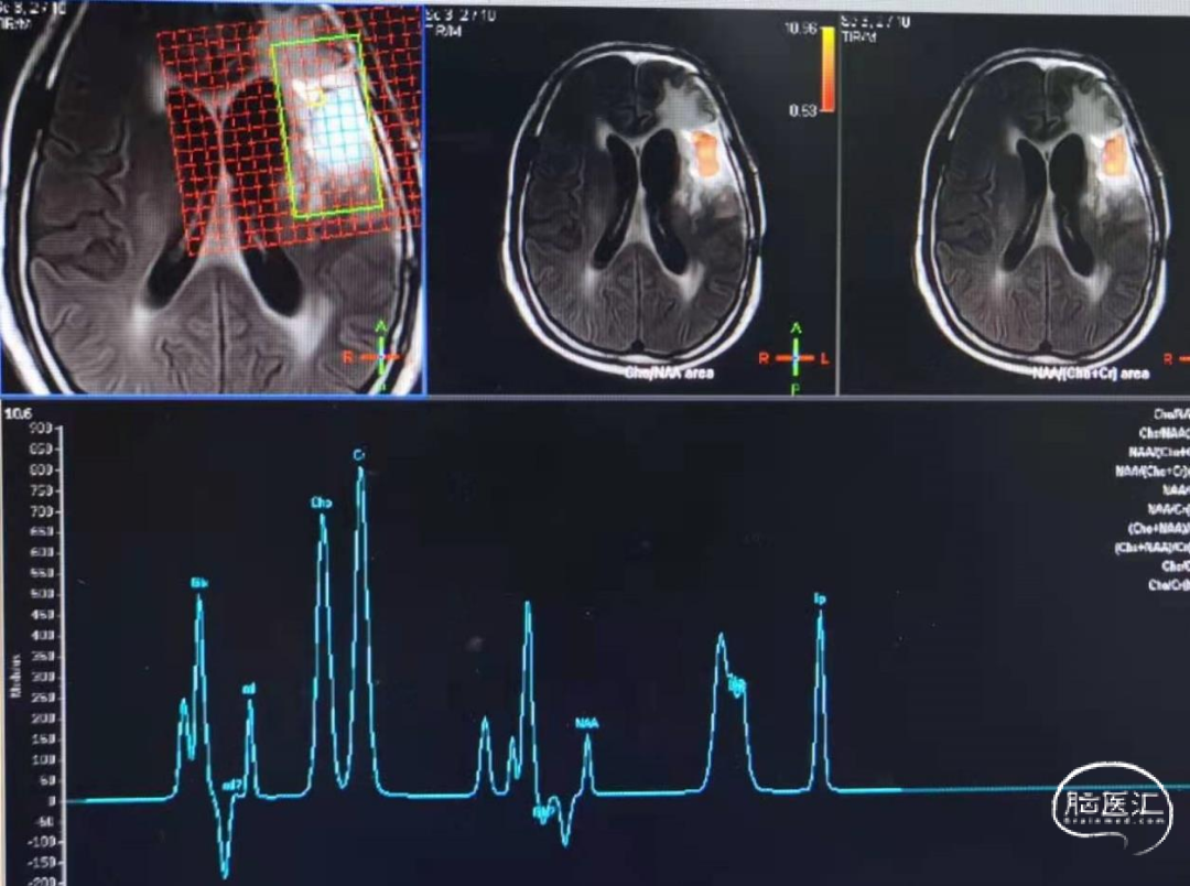 辅助TMZ治疗过程中每2-3月复查MRI。治疗中曾出现水肿范围增大,尽管有部分区域弥散受限和MRS异常及血流量增加,但是临床症状未加重,仍继续原方案治疗,后续监测PWI显示病变区灌注减低。提示持续肿瘤电场治疗可以使病变长期稳定。此患者每天佩戴肿瘤电场治疗时间接近22小时,中间出现头皮发红和小水泡,经局部外用皮质类固醇和外用抗生素,暂停2天治疗恢复。至今随访25月稳定。说明肿瘤电场治疗联合TMZ治疗较单TMZ治疗明显延长胶质母细胞瘤患者PFS及OS,临床应积极推广使用。