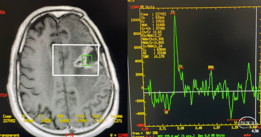 放疗后17月(2021-12-20)MRS显示左颞叶感兴趣区Cho/NAA约1.19-5.53:图示。