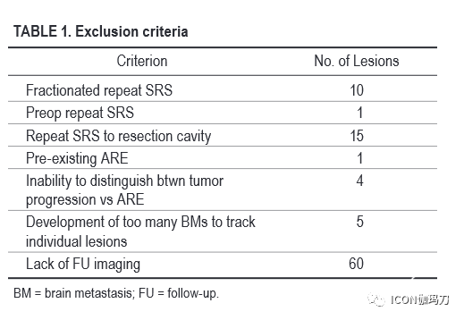 在我们医院接受伽玛刀SRS治疗的患者和每一个脑转移瘤已被纳入数据库,包括任何之前接受过放疗和/或SRS或HFSRS照射单个脑转移瘤的分类(在我们医院或其他地方)。在我们的机构(人类研究保护计划)伦理审查委员会批准的本研究中,我们回顾性评估了既往SRS或HFSRS治疗同一病变后用补救性单次分个SRS治疗的转移瘤。排除标准列于表1。