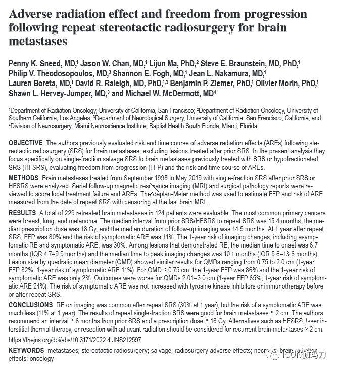 《Journal of Neurosurgery》杂志 2022年5月20日在线发表美国University of California, San Francisco.的Penny K Sneed , Jason W Chan , Lijun Ma ,等撰写的《重复立体定向放射外科治疗脑转移瘤的放射副作用和无进展。Adverse radiation effect and freedom from progression following repeat stereotactic radiosurgery for brain metastases》(doi: 10.3171/2022.4.JNS212597. )。