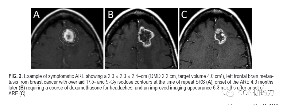 图2。ARE症状的例子显示2.0x2.3x2.4厘米(QMD 2.2厘米,靶体积4.0cm3),对来自乳腺癌的左额脑转移瘤,重复SRS 治疗时以17.5 - 和9-Gy等剂量线轮廓覆盖(a), 4.3个月后开始出现ARE(B)需要一个疗程的地塞米松治疗头痛、ARE发病6.3个月后影像学表现改善(C)。