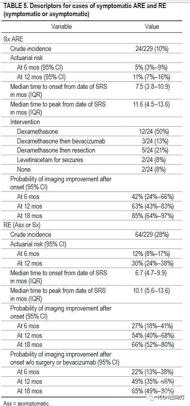 与单纯采用QMD分类的SRS治疗相比,重复SRS提供相似的FFP,但有症状性ARE的风险增加了2 - 3倍。然而,开始重复SRS后RE起病的时间过程(平均6.7个月,IQR4.7 - 9.9个月)类似于观察我们之前对SRS治疗脑转移瘤将重复SRS治疗除外所作分析的结果(中位7.2个月,85%的患者SRS治疗后3-18个月发生)。此外,未接受手术或贝伐珠单抗治疗的REs患者1年影像学改善的概率(49%;表5)与前一分析的相似(57%)。