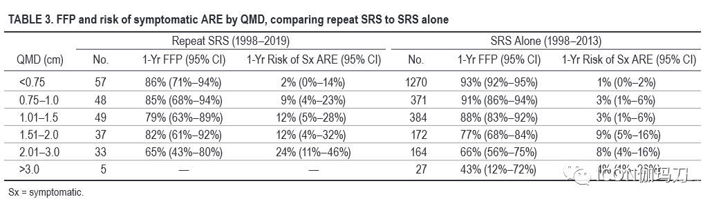 在我们的研究中,肿瘤大小是一个强有力的预后指标。QMD<0.75 cm,重复SRS治疗脑转移瘤患者的治疗效果良好; 1年FFP为86%,1年出现症状性ARE的风险仅为2%,QMD为0.75-2.0 cm, 1年FFP为82%,1年出现症状性ARE的风险为11%。相比之下,脑转移瘤2.01-3.0 cm的预后相对较差,1年FFP为65%,1年有症状的ARE风险为24%。只有5个病灶>3.0 cm的患者接受了治疗,尽管在该亚群中没有观察到ARE,但这一发现可能是因为随访时间短,失效率高,以及我们没有对ARE与局部失效同时进行评分。