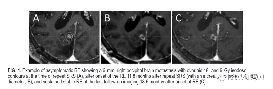 图1。举例显示无症状放射反应(RE),6毫米,右侧枕部脑转移瘤,重复SRS治疗时以18和9 Gy等剂量线覆盖(a),在重复SRS治疗11.8个月后起病(直径从6毫米增加到10毫米;(B),并在RE起病18.6个月后的最后一次随访影像中RE持续稳定 (C)。