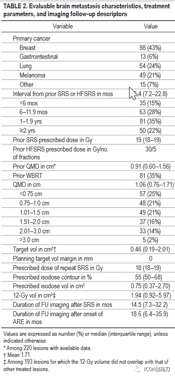 124例患者中,共有229例脑转移瘤可作评估。最常见的原发癌是乳腺癌、肺癌和黑色素瘤。从既往SRS/HFSRS到重复SRS的中位间隔为15.4个月,中位处方剂量为18 Gy,中位随访成像时间为14.5个月。在重复SRS治疗后1年,FFP率为80%,症状性ARE的风险发生率为11%。包括无症状副作用(RE)和有症状ARE的1年影像学改变的风险发生率为30%。在显示副作用(RE)的病灶中,中位发病时间为6.7个月(IQR为4.7-9.9个月),中位影像学改变时间为10.1个月(IQR为5.6-13.6个月)。病灶大小的二次平均直径(QMD)在0.75 - 2.0 cm范围内显示相似的结果(1年FFP为82%, 1年出现症状性ARE风险为11%)。QMD <0.75 cm, 1年FFP为86%,1年出现症状性ARE的风险仅为2%。QMDs 2.01-3.0 cm组预后较差(1年FFP 65%, 1年症状性ARE风险24%)。在重复SRS治疗前后,酪氨酸激酶抑制剂或免疫治疗均不会增加症状性ARE的风险。