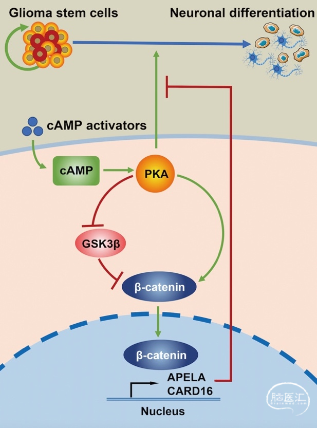 在本项研究中,赛克教授团队首先证明激活cAMP信号通路能够驱动胶质瘤干细胞向神经元方向分化。与此同时,赛克教授团队还发现,cAMP虽然能够诱导胶质瘤干细胞分化,但分化程度并不彻底。为了探寻其中原因,赛克教授团队通过转录组学及免疫荧光等分子生物学手段进行了深入分析。研究结果表明,cAMP激动剂虽然能够诱导胶质瘤干细胞产生分化,但同时也通过PKA信号转导通路稳定并活化了β-catenin分子。随后,活化的β-catenin进入细胞核促进了APELA和CARD16的转录,从而抑制了cAMP触发的诱导分化。体外抑制β-catenin或下游靶基因APELA和CARD16可以有效地促进cAMP信号诱导GSCs向神经元方向分化。动物实验表明,联合使用β-catenin信号通路抑制剂与cAMP激活剂能够协同抑制胶质瘤干细胞小鼠颅内原位瘤模型的生存期。