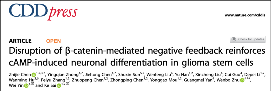 近日,中山大学肿瘤防治中心神经外科赛克教授团队在国际权威杂志Cell Death & Disease发表了题为“Disruption of β-catenin-mediated Negative Feedback Reinforces cAMP-induced Neuronal Differentiation in Glioma Stem Cells”(JCR 1区,IF:8.469)的论文。该研究揭示了cAMP激动剂诱导胶质瘤干细胞分化过程中的负性反馈机制。中山大学肿瘤防治中心神经外科赛克教授、中山医学院朱文博教授及银巍教授为共同通讯作者,中山大学肿瘤防治中心陈智杰(目前于中山大学附属第三医院工作)、中山医学院钟颖仟与陈洁虹为论文第一作者。